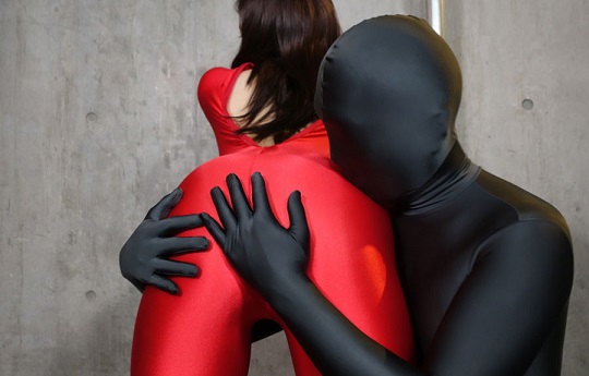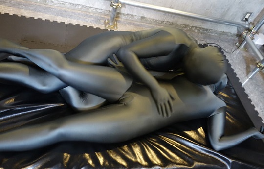 男女が同じ撥水グレーの全身タイツに着替えて重なり合います。視界を遮られた上で全身をサラサラタイツに覆われるていることに興奮するのです。まるで未知なる領域。これはゼンタイフェチ、素材フェチ、競泳水着フェチの方々は必見のエロさです。